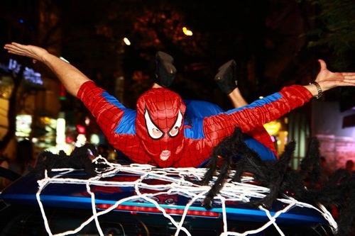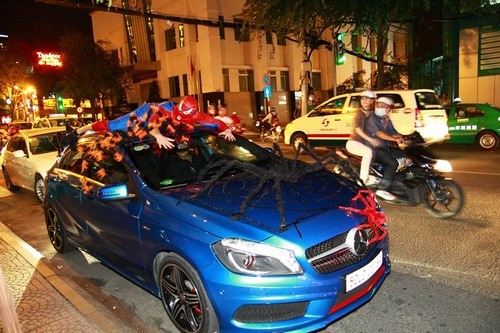 Xuất hiện trên đường phố Sài Gòn trong đêm, chiếc xe thu hút không ít sự chú ý của người đi đường, đặc biệt hai người đi trên xe còn được hóa trang thành nhân vật “Spider Man” nổi tiếng, người lái xe thì đeo chiếc mặt nạ khá “kinh dị”.