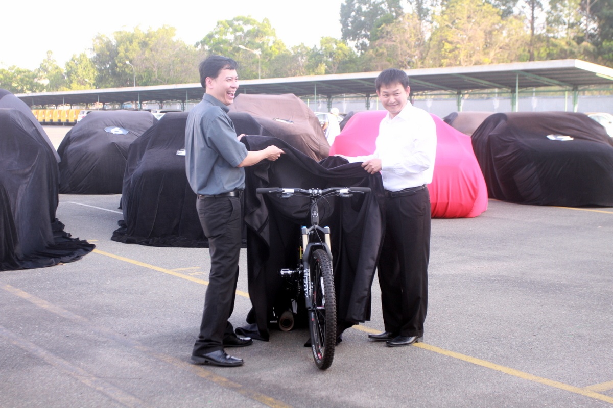 | Mẫu xe đạp mới của Mercedes-Benz xuất hiện trong khuôn viên nhà máy tại TP.HCM. Đại diện của hãng mở bạt trình làng sản phẩm và gọi vui đây là mẫu "siêu xe" mui trần. Chiếc xe đạp này là một trong 19 sản phẩm được hãng này bán tại Việt Nam trong năm 2014. |