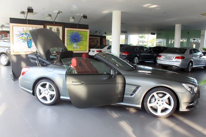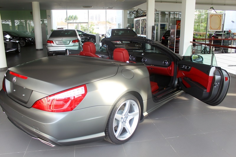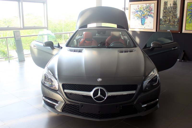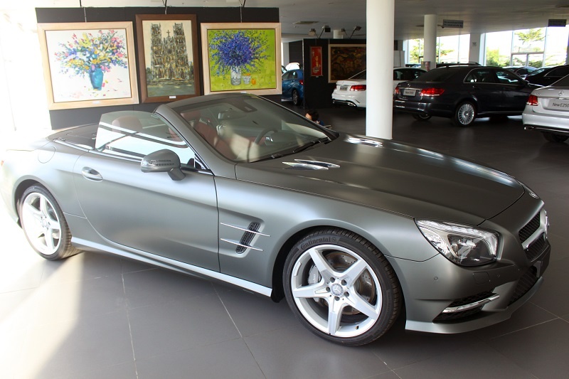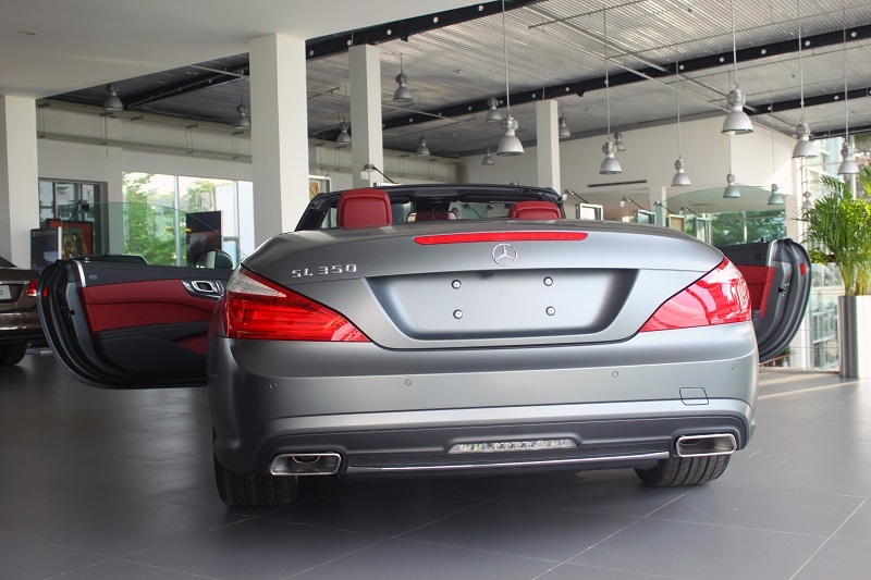 Chiếc SL 350 đời mới vừa được Mercedes nhập khẩu chính hãng về showroom tại Phú Mỹ Hưng, TP.HCM. Xe nổi bật với lớp sơn mờ mạnh mẽ.