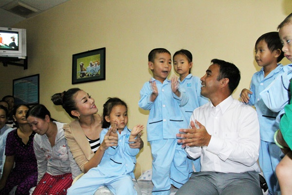 | Quyền Linh và Thanh Hằng - hai thành viên của CLB Người nổi tiếng Mercedes - đến thăm và vui đùa cùng các em nhỏ. |