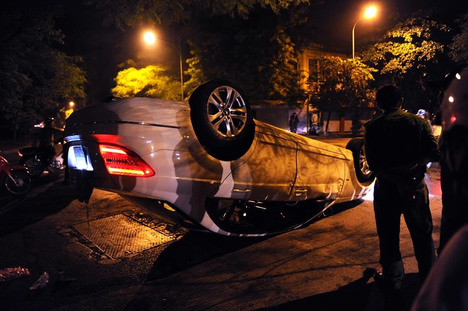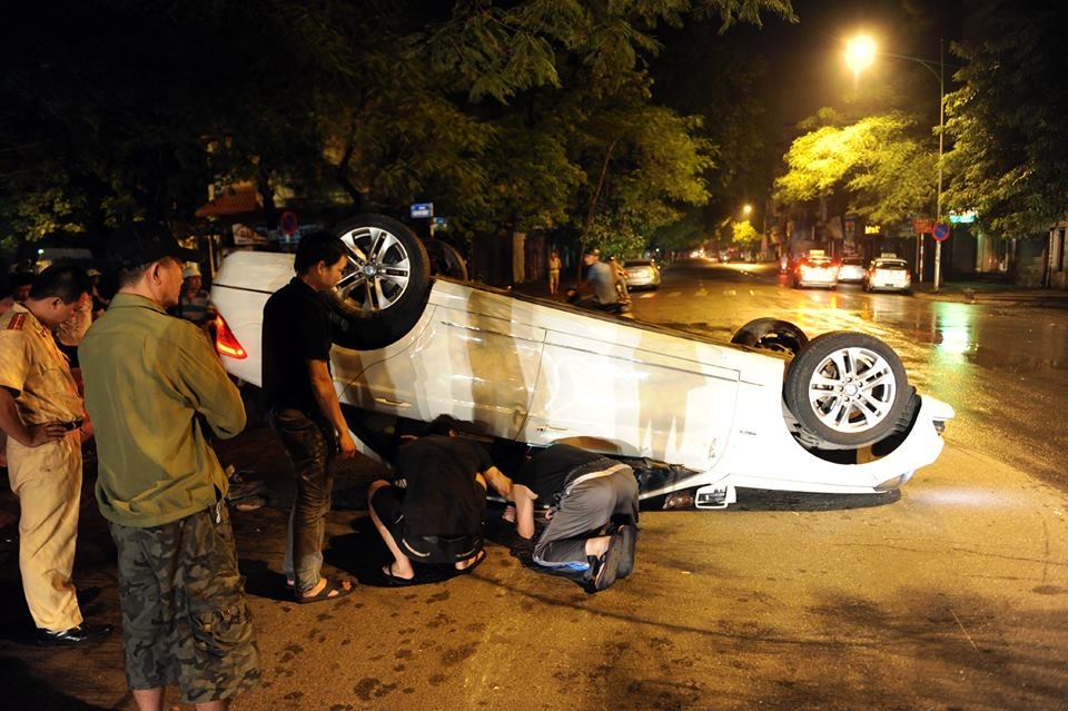 | Tài xế chui ra khỏi xe, người nồng nặc mùi rượu, bị thương nhẹ ở tay. |