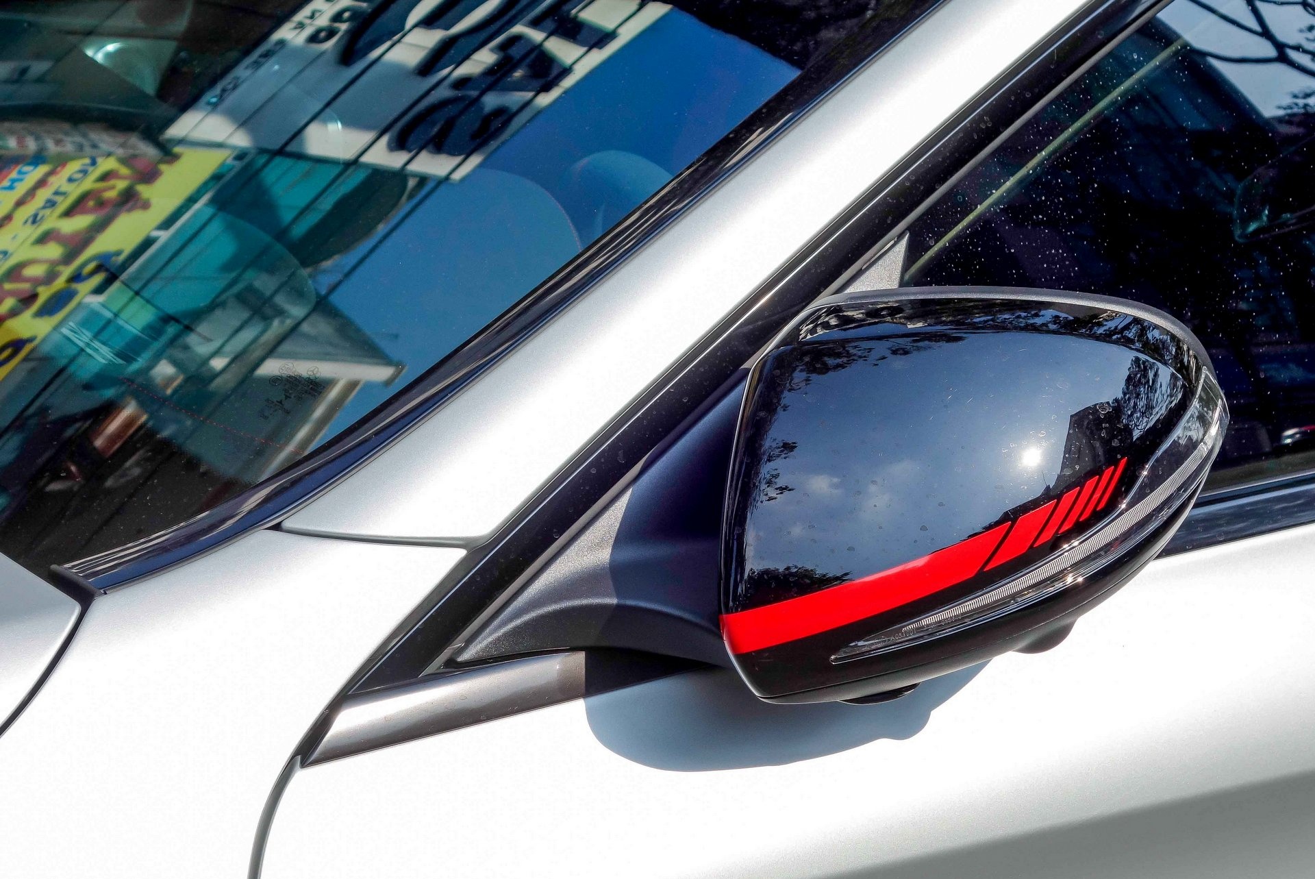 | Gương chiếu hậu màu đen tương phản với thân xe, nổi bật nhờ họa tiết gạch đỏ trên bản