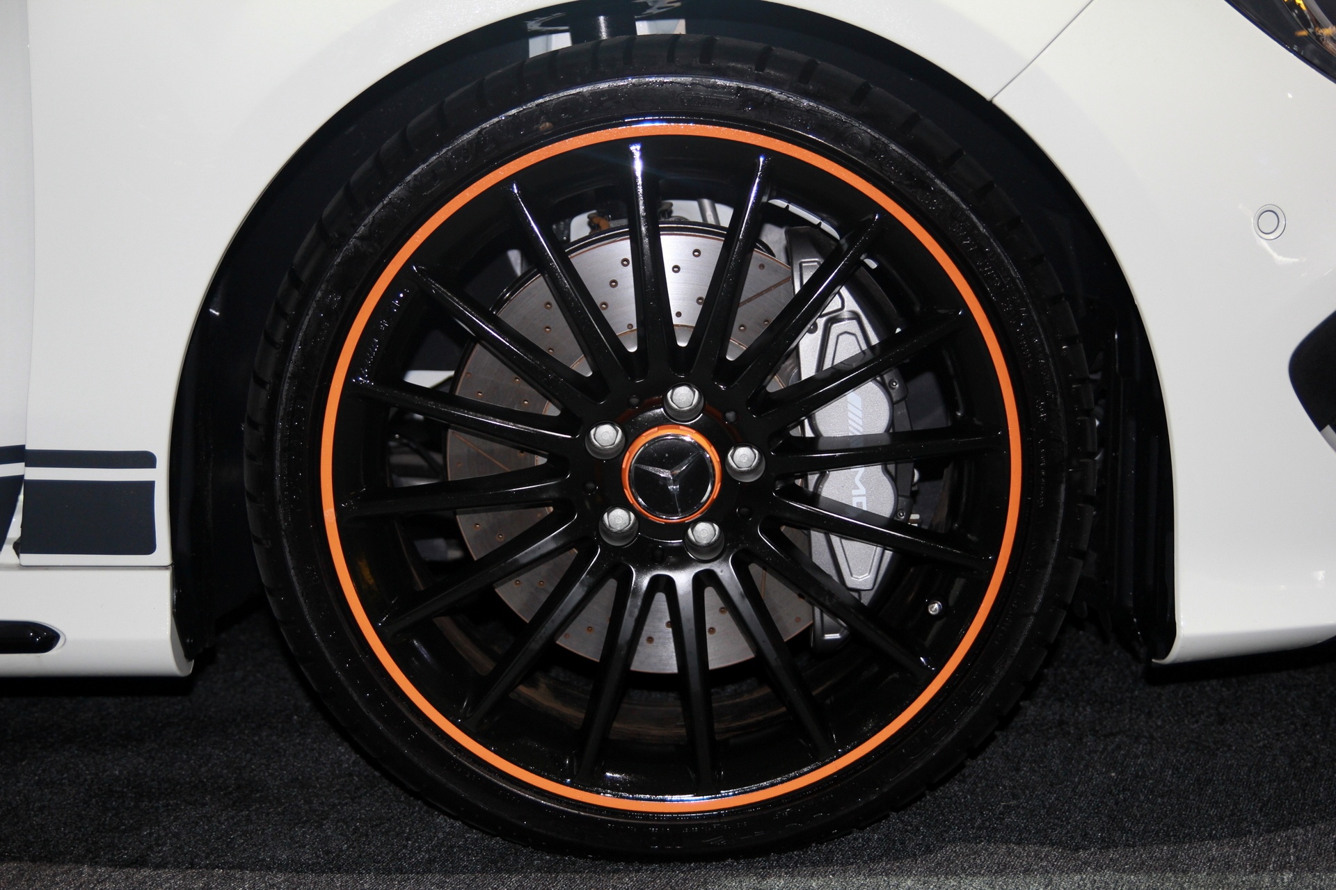 Vành 19 inch đa chấu màu đen nhám với những đường chỉ màu cam. Bên trong là hệ thống phanh hiệu suất cao AMG.