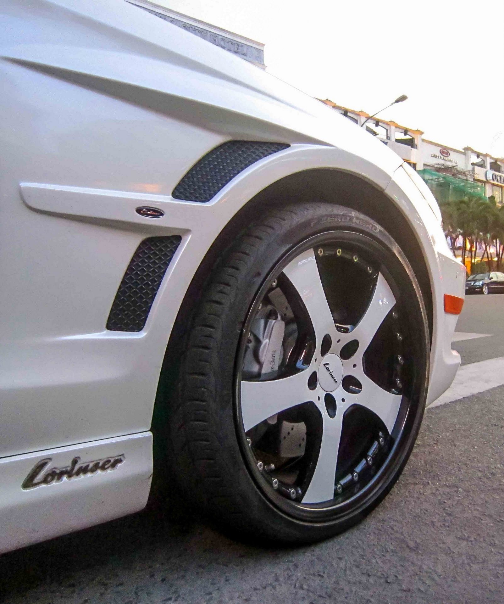 | Một nét đặc biệt trên những bản độ Lorinser là phần ốp cản trước được cắt khe thoát gió hình mang cá. Trước đây, xe được lắp bộ vành độ chính hãng của Lorinser, tuy nhiên điều kiện đường sá Việt Nam không phù hợp nên phải lắp lại vành zin. |