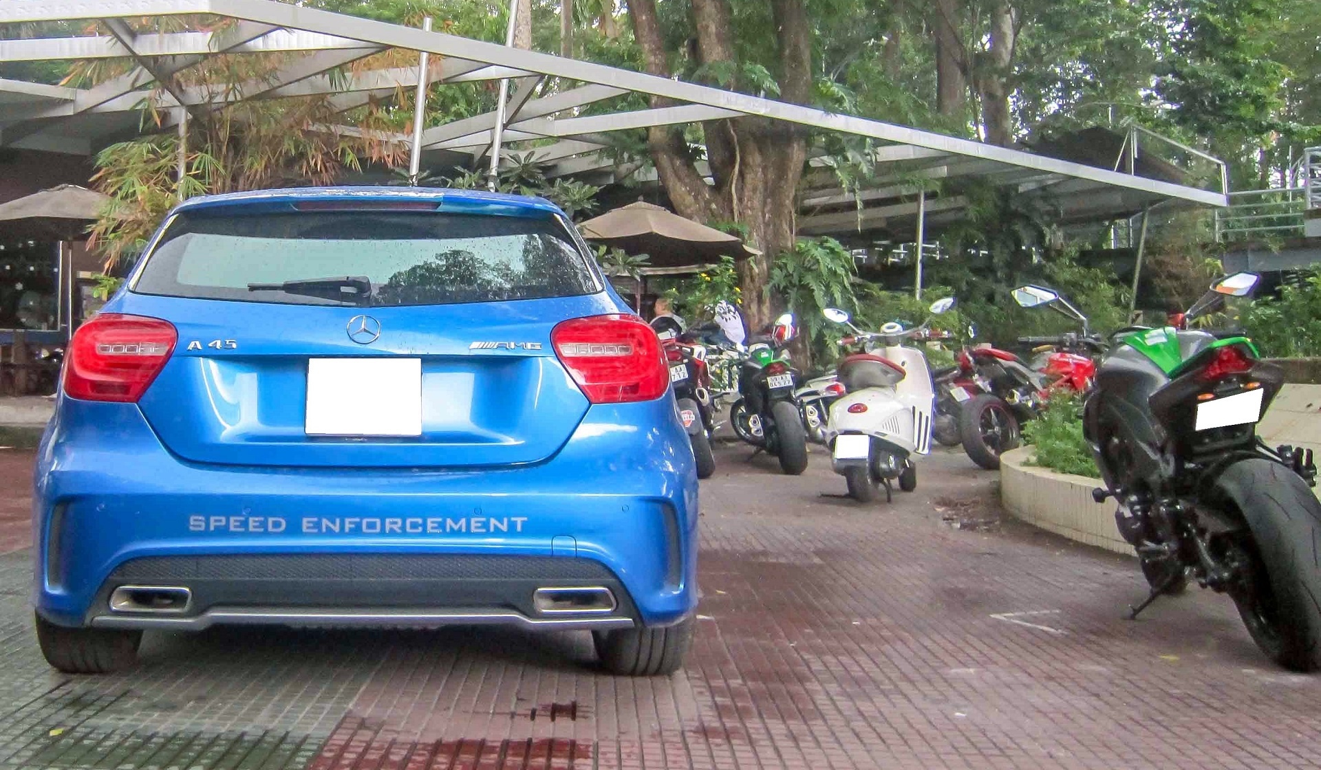 | Chiếc Mercedes A45 AMG màu xanh đầu tiên tại Sài Gòn xuất hiện trước cửa một quán cà phê. Bên cạnh còn có những chiếc mô tô đắt tiền như Kawasaki Z1000 2014 hay Vespa 946. |
