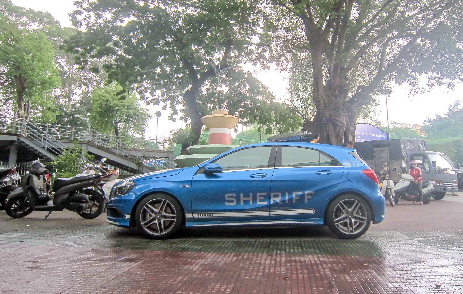Một chiếc Mercedes A45 AMG màu xanh có dán decal "Sheriff" (cảnh sát trưởng), cùng chiếc Vespa 946 và nhiều mô tô độc đáo cùng tụ họp tại một quán cà phê ở Sài Gòn.