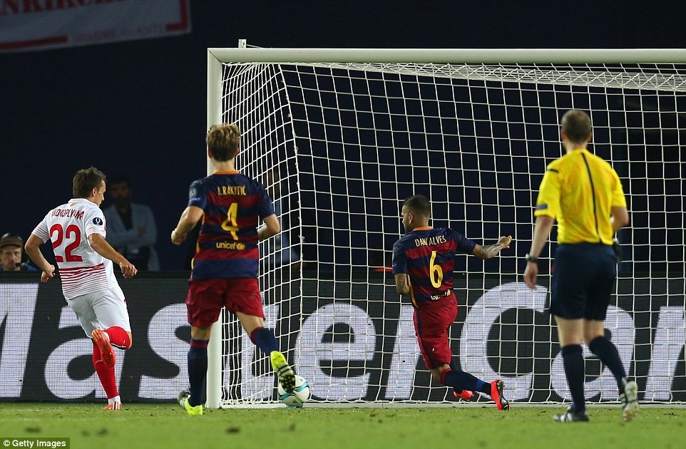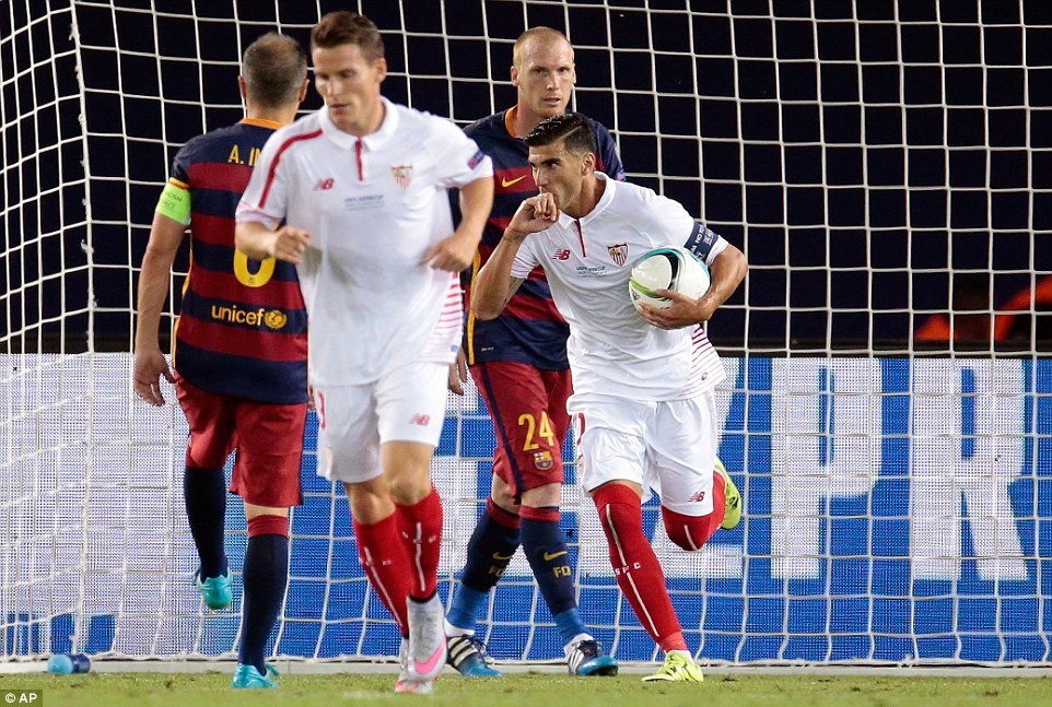 Phút 71, Sevilla được hưởng quả penalty sau khi Jeremy Mathieu phạm lỗi với Vitolo trong khu vực 16m50.