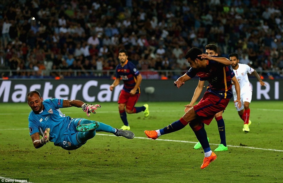 Barcelona đoạt siêu cúp châu Âu lần thứ năm trong lịch sử sau khi vượt qua Sevilla ở trận rượt đuổi tỷ số kịch tính. Sau khi để đối phương vượt lên ở phút thứ 3, gã khổng lồ xứ Catalan ghi liền 4 bàn, nhưng Sevilla gỡ hòa 4-4 trước khi hiệp 2 khép lại. Trong hiệp phụ, Barcelona có bàn thắng ấn định tỷ số 5-4 sau pha dứt điểm cận thành của Pedro ở phút 115.