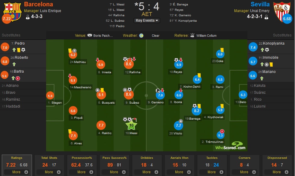 Hai đội thi đấu 30 phút hiệp phụ để phân định thắng bại. Phút 115, Pedro - cầu thủ vào sân thay Mascherano ở phút 93 - ghi bàn ấn định chiến thắng 5-4 cho Barcelona.