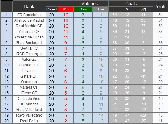 Chỉ giành 1 điểm ở trận này, nhưng Barca vẫn bảo toàn được vị trí số 1 của họ. Bởi lẽ ở trận đấu cùng giờ, Atletico Madrid cũng bị Sevilla cầm hòa 1-1 trên sân nhà cho dù có được bàn mở tỷ số từ khá sớm của David Villa. Tuy vậy, thầy trò Tata Martino không vì thế mà có thể nở nụ cười, bởi khoảng cách giữa họ với Real Madrid sau vòng 20 đã được thu hẹp xuống còn 1 điểm.