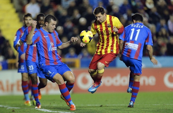 | Phải nỗ lực lắm Messi mới thoát khỏi được sự kèm cặp của các cầu thủ Levante. Nhưng ở những cú sút quyết định, M10 lại không thể ghi bàn. |