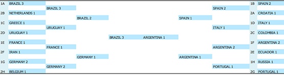 Theo dự đoán của Goldman Sachs, nước chủ nhà Brazil chính là đội tuyển có cơ hội đăng quang ngôi vô địch lớn nhất với 48,5%. Lần lượt theo sau là Argentina (14,1%), Đức (11,4%) và Tây Ban Nha (9,8%). Trong đó cũng đưa ra dự đoán về các đội không có chút cơ hội vô địch nào như Nhật Bản, Honduras hay Algeria.