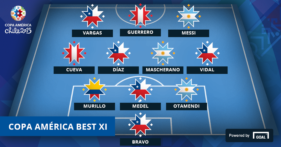 | Đội hình tiêu biểu Copa America 2015 theo sơ đồ 3-4-3 do Goal bình chọn. |