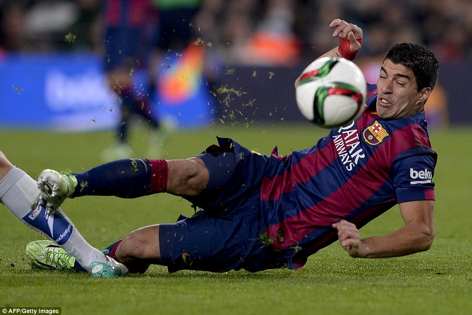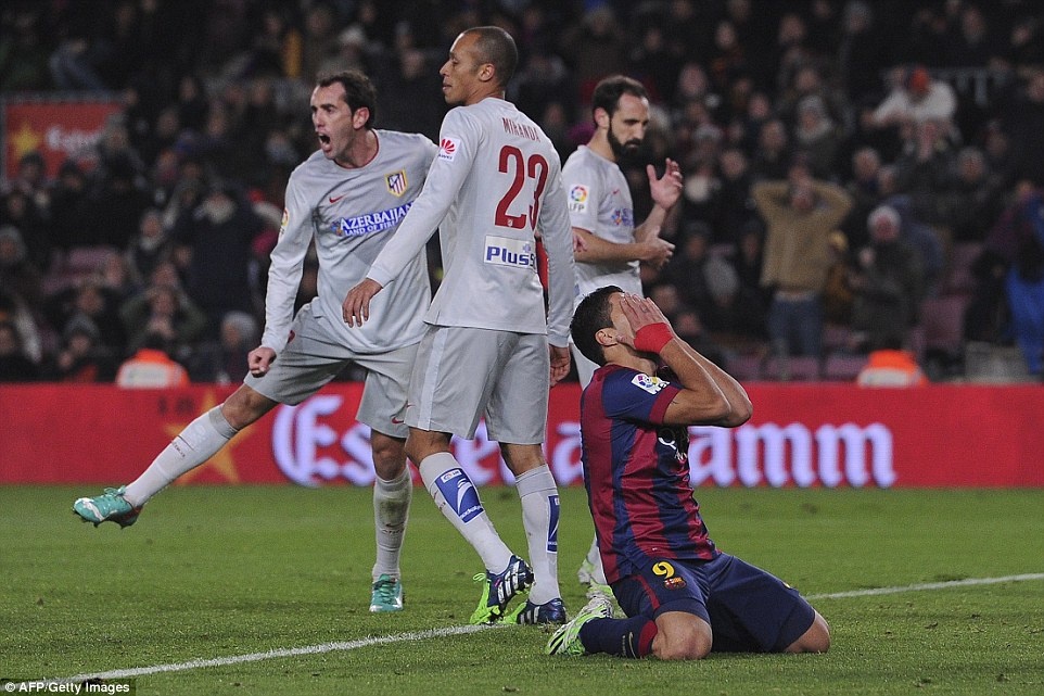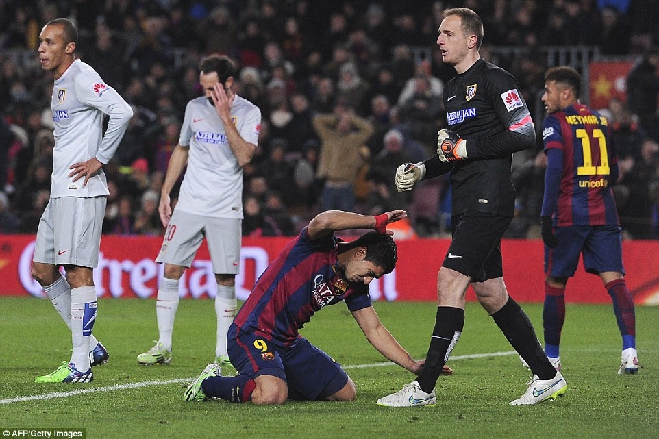 Chân sút người Uruguay đập tay xuống đất thể hiện sự nuối tiếc vì không thể giúp Barca vượt lên dẫn trước.