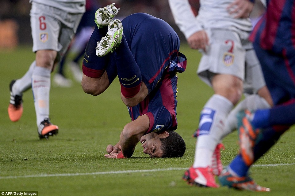Tiền đạo của Barca ngã cắm đầu xuống đất sau pha tranh chấp với hậu vệ đối phương.