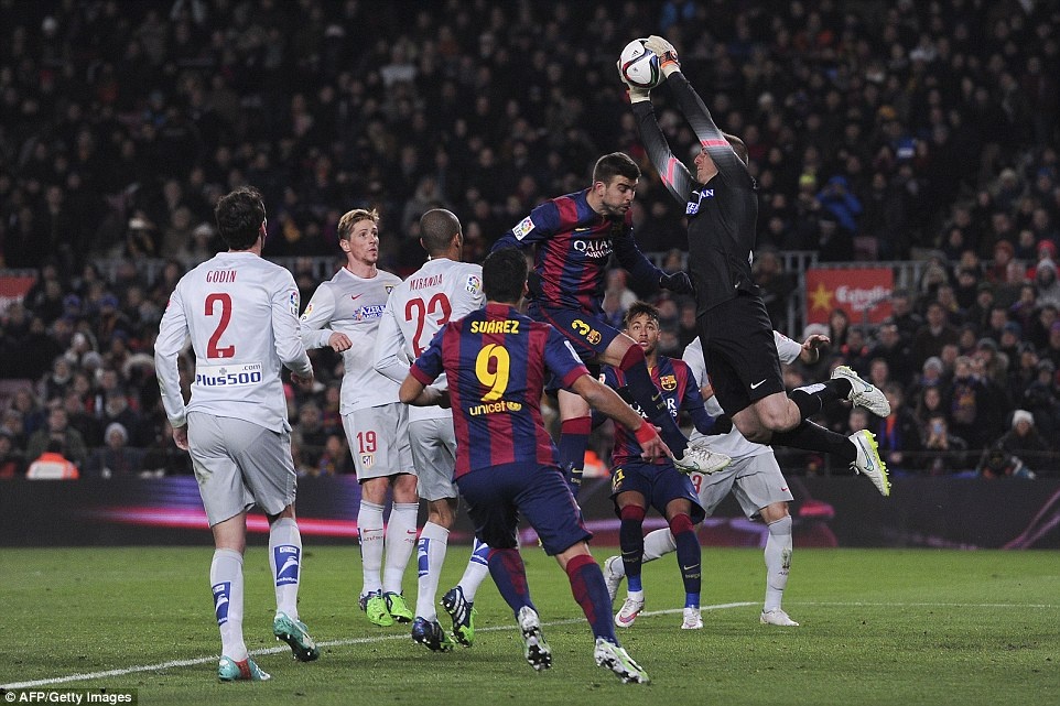 Phút 36, Luis Suarez dứt điểm vọt xà ở cự ly gần sau đường chuyền thuận lợi của Rakitic.