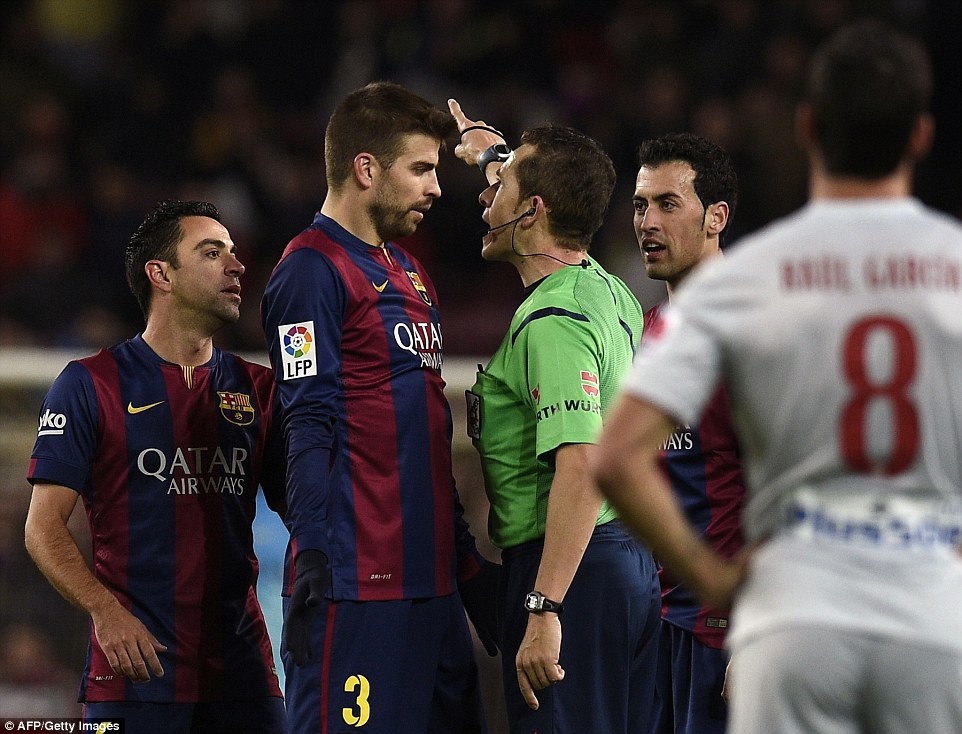 Pique phản ứng với trọng tài vì trọng tài không cho Barca hưởng penalty sau pha phạm lỗi của Godin với Suarez trong vòng cấm.