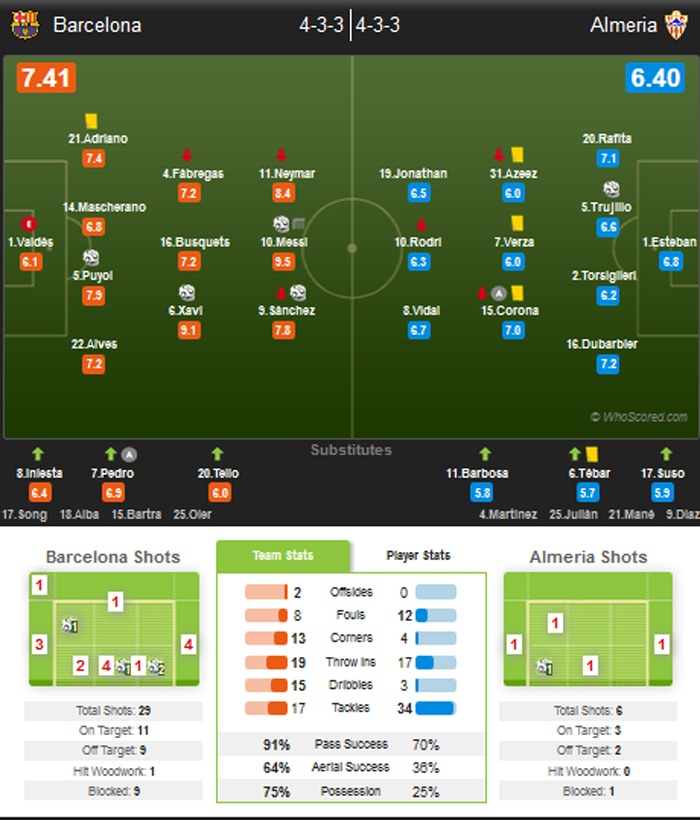 Hàng công Barca hoạt động quá hiệu quả nhưng hàng thủ của họ lại lộ ra những sai lầm chết người. Một lần nữa đội bóng chủ sân Nou Camp phải trả giá vì yếu điểm chống bóng bổng. Phút 27, trong tình huống Almeria được hưởng phạt góc, các hậu vệ Barca quên theo kèm Angel Trujillo, để cầu thủ này dễ dàng đánh đầu cận thành rút ngắn tỷ số xuống 1-2. Cả hiệp một đội khách chỉ cầm bóng 24%, tung được 2 cú dứt điểm trúng khung thành Valdes nhưng họ cũng đã có được 1 bàn thắng.