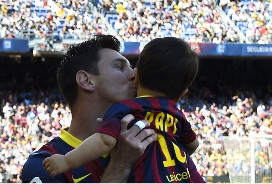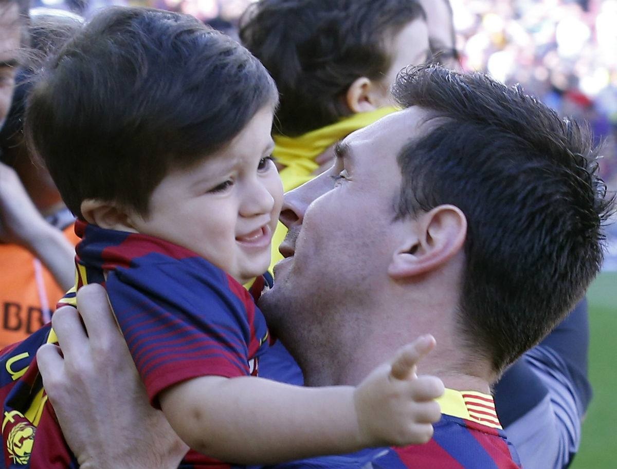 Chân sút số 1 Barca ôm hôn quý tử đầu lòng Thiago ngay dưới sân. Ảnh: AFP.