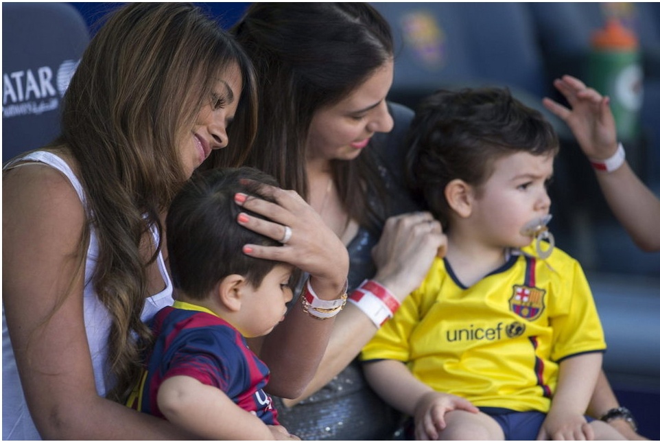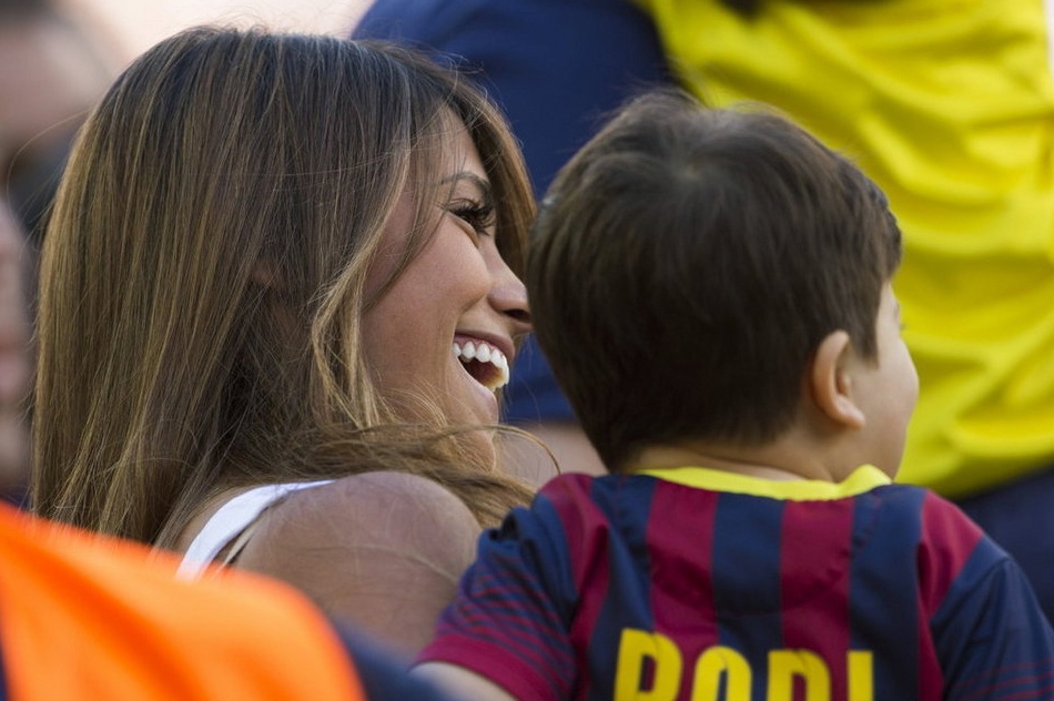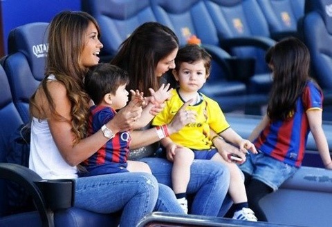 Trước trận gặp Getafe ở vòng 36 La Liga, các cầu thủ Barca đưa cả vợ con tới sân Nou Camp để tưởng niệm HLV quá cố Tito Vilanova. Người đẹp Antonella - bạn gái của ngôi sao Argentina Lionel Messi cũng bế con tới tham gia sự kiện và cổ vũ đội bóng của bạn trai. Gia đình nhỏ của Messi nhanh chóng trở thành tâm điểm báo giới bởi những hình ảnh ngọt ngào, tình cảm hiếm thấy. Ảnh: AFP.