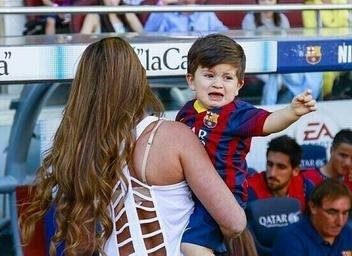 Thiago khóc mếu khi bố Messi phải ra sân thi đấu. Ảnh: Twitter.