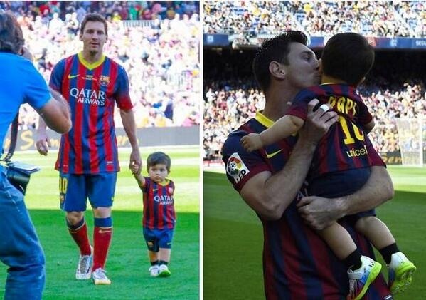 M10 hãnh diện dắt con trai đầu lòng xuống sân cỏ. Thiago ngày càng chững chạc và ra dáng một ngôi sao bóng đá như bố.