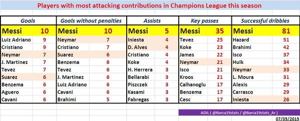 Trong trận lượt đi gặp Bayern, Messi còn kiến tạo để Neymar ấn định chiến thắng 3-0 cho Barca. Theo đó, tiền đạo 27 tuổi chiếm luôn vị trí số 1 trong danh sách kiến tạo với 5 lần, hơn 1 lần so với hai đồng đội Iniesta, Dani Alves và các đối thủ khác như Cesc Fabregas (Chelsea), Koke (Atletico), Cristiano Ronaldo (Real).