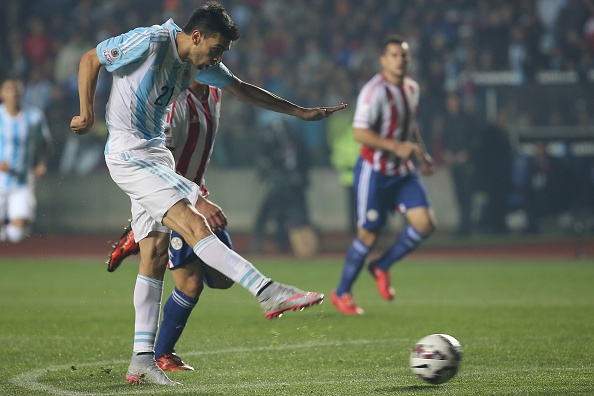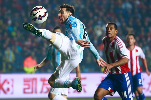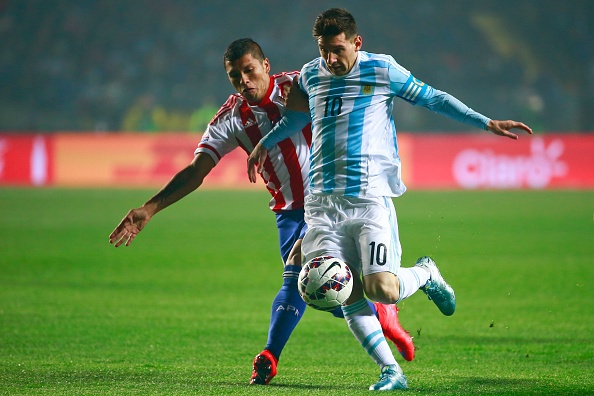 | Tiền đạo khoác áo số 10 của ĐT Argentina luôn được các hậu vệ bên phía Paraguay theo kèm quyết liệt. |