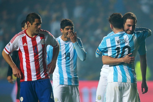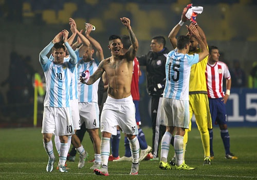 | Lionel Messi cùng đồng đội vui mừng khi đoạt vé vào chung kết Copa America sau 8 năm chờ đợi. Họ sẽ gặp chủ nhà Chile trong trận tranh cúp ngày 5/7. |