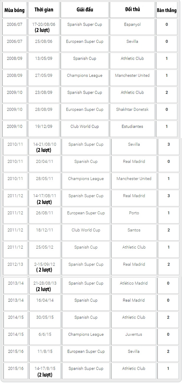 Ngày 20/8/2006, Leo Messi có mặt trong trận chung kết Siêu Cúp Tây Ban Nha giữa Barca và Espanyol. Đó là trận chung kết đầu tiên của Messi cùng Barca và anh tịt ngòi trong trận cầu này. Tuy nhiên, kể từ cột mốc đó đến nay, Messi đã chơi thêm tới 27 trận chung kết khác cùng đội bóng xứ Catalan và hiếm khi nào anh tịt ngòi trong những trận đấu quyết định đó.