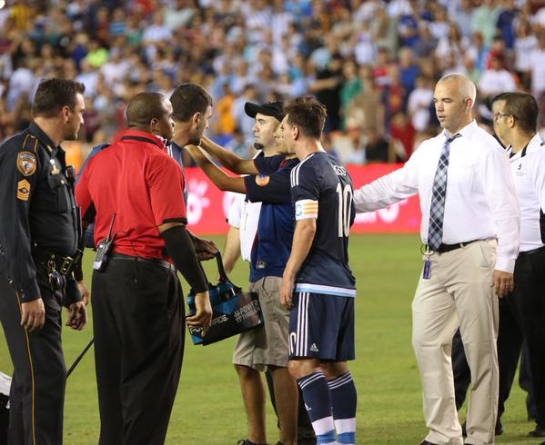 | Sau trận, mộ CĐV lao xuống sân BBVA Compass (Houston, Texas) đòi chụp ảnh với Lionel Messi nhưng bị các nhân viên an ninh ngăn lại. |