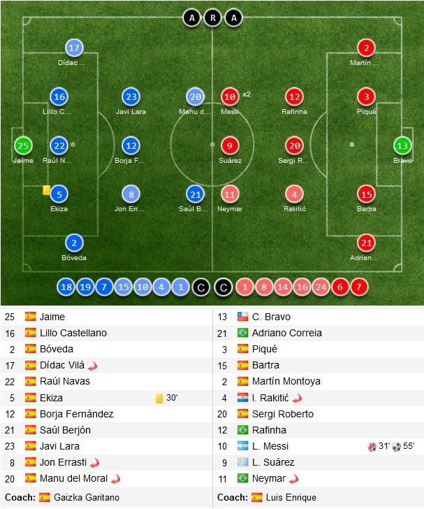 | Chung cuộc, Barca giành chiến thắng 2-0. Với kết quả này, đội quân của HLV Luis Enrique giữ vững ngôi đầu bảng xếp hạng La Liga với 65 điểm sau 27 vòng đấu, hơn Real 4 điểm nhưng chơi nhiều hơn 1 trận. |