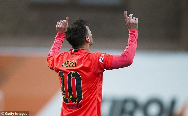 | Messi ăn mừng pha lập công thứ 32 tại La Liga mùa này. Cú đúp vào lưới Eibar cũng giúp chân sút của Barca quân bình tổng số bàn thắng trên mọi mặt trận với Cristiano Ronaldo - 43 bàn. |
