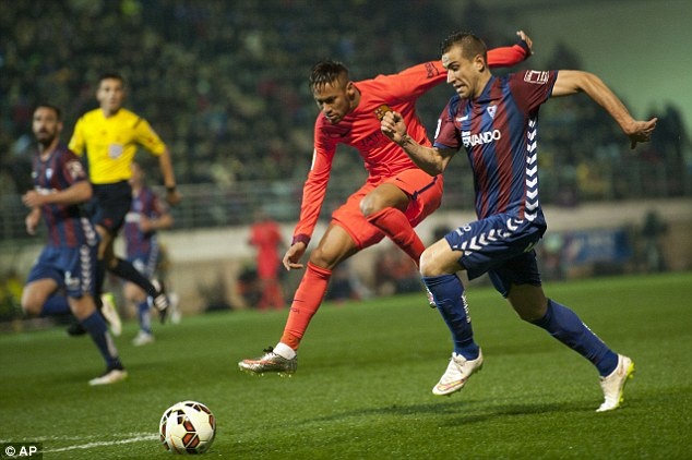 | Neymar bỏ lỡ cơ hội ghi bàn cho đội bóng xứ Catalunya ở phút 52 sau cú chọc khe tinh tế của Messi. |
