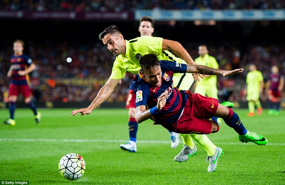 | Tình huống Neymar mang về quả penalty cho đội chủ sân Nou Camp phút 61 sau khi buộc Angel Trujillo phạm lỗi trong vòng cấm. |