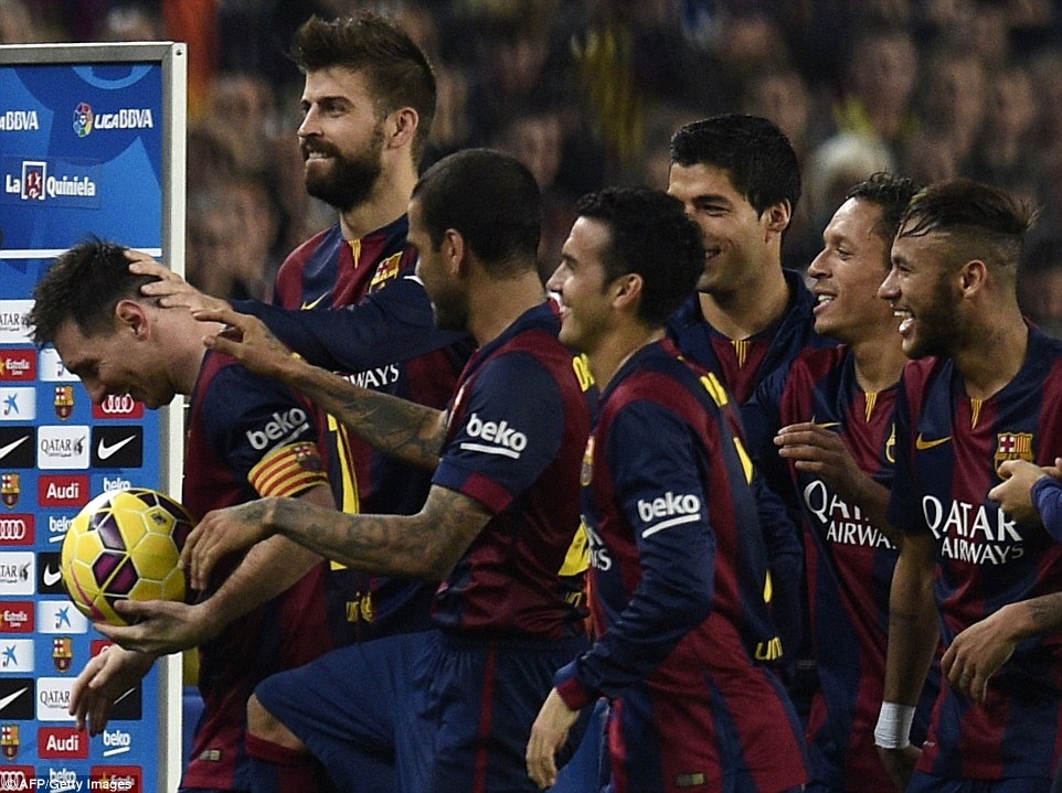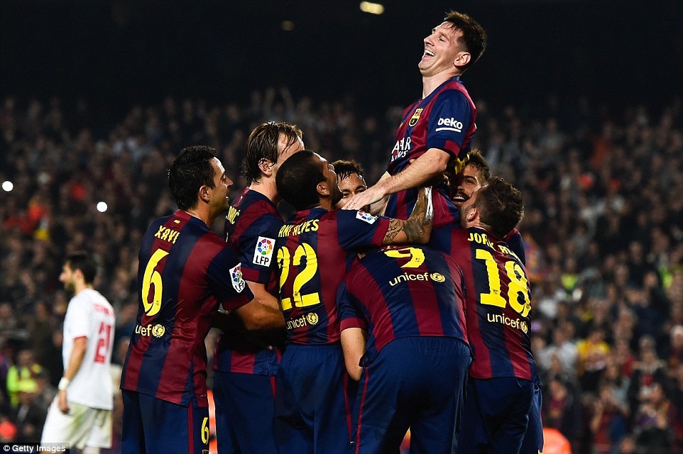 | Các đồng đội công kênh siêu sao người Argentina khi anh chính thức phá kỷ lục của huyền thoại Telmo Zarra. |