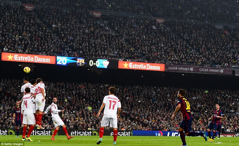 | Sau một vài cơ hội bỏ lỡ, Barca vượt lên dẫn trước ở phút 21 nhờ cú sút phạt đẳng cấp của Lionel Messi. |
