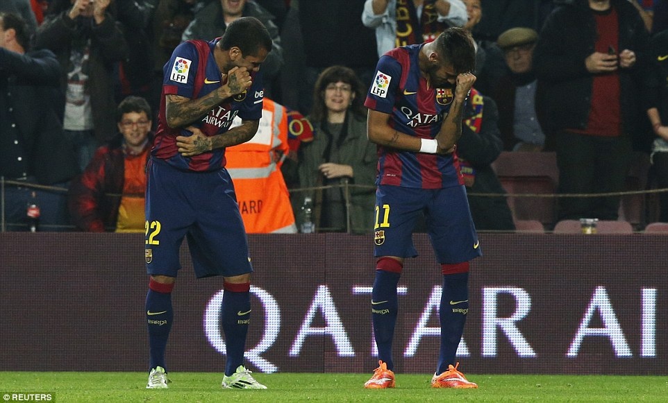 | Neymar và đàn anh đồng hương Dani Alves nhảy điệu samba sau khi lập công cho đội bóng xứ Catalunya. |