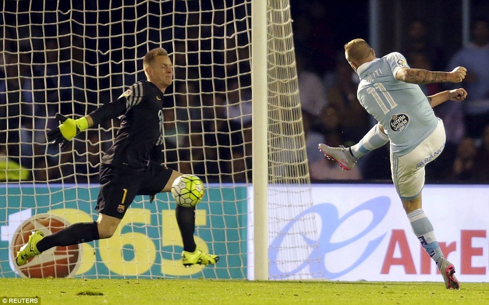 | Trung vệ Gerard Pique hoàn toàn bất lực trong việc theo kèm chân sút 28 tuổi của Celta Vigo. |