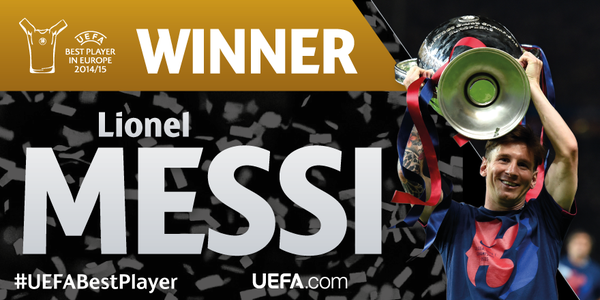 Các nhà báo đến từ 54 thành viên của Liên đoàn bóng đá châu Âu (UEFA) chọn cầu thủ xuất sắc châu Âu mùa trước. Tiền đạo Messi của Barcelona được đánh giá cao. Mùa giải 2014 - 2015, anh ghi 58 bàn cho gã khổng lồ xứ Catalan trên mọi mặt trận.