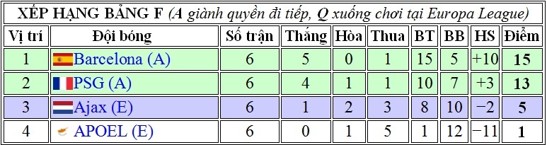 | Thắng chung cuộc 3-1, Barca soán ngôi đầu bảng F của chính PSG với 15 điểm, nhiều hơn đại diện của Pháp 2 điểm. |