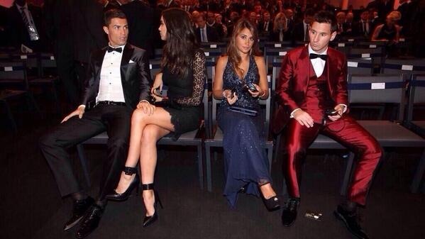 | Gu thời trang của Ronaldo và bạn gái Irina Shayk rõ ràng là tinh tế hơn hẳn so với cặp đôi Messi - Antonella. Năm nay, lần đầu tiên trong 5 năm trở lại đây, Messi để tuột danh hiệu Quả bóng vàng vào tay đối thủ. Đúng như dự đoán, Ronaldo là cầu thủ xuất sắc vượt mặt M10 lên bục vinh dự nhận giải thưởng cao quý này. |