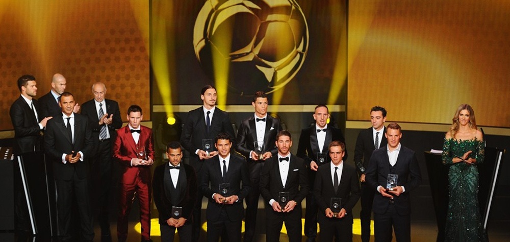 | Messi mặc vest chấm bi khi nhận Quả bóng vàng FIFA. |