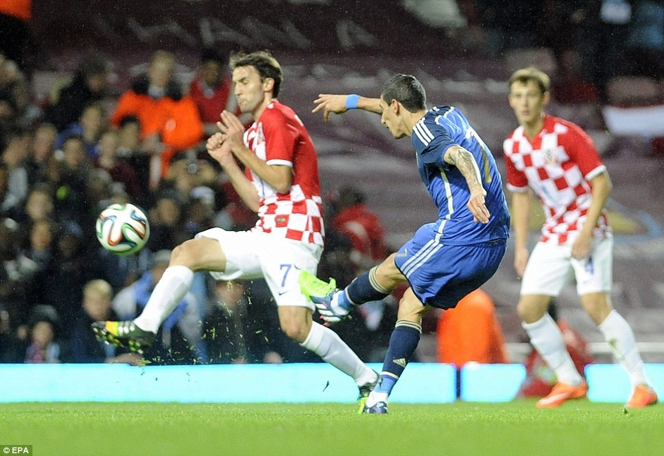 | Tân binh của M.U, Angel Di Maria cũng bất lực trong việc xuyên thủng hàng phòng ngự chắc chắn của Croatia. |