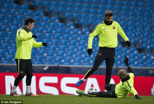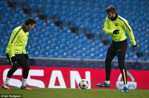 | Nhờ sự ủng hộ của HLV Luis Enrique mà Messi và Pique có được tâm lý rất tốt trong buổi tập làm quen mặt sân Etihad vào ngày hôm qua (23/2). |