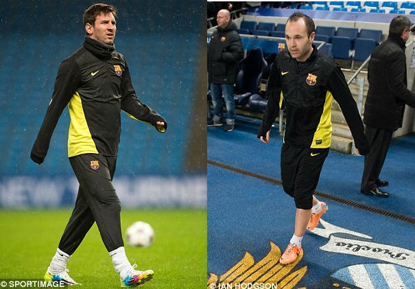 | Messi (trái) và Iniesta (phải) sẽ là hai cầu thủ nhận được sự chú ý đặc biệt trong trận đấu diễn ra trên sân Etihad vào lúc 02h45 ngày 19/2 (giờ Việt Nam). Các cầu thủ Barca phải mặc ấm khi làm quen sân Etihad do thời tiết lúc này tại Manchester rất lạnh, nhiệt độ có lúc xuống 3 độ C. |