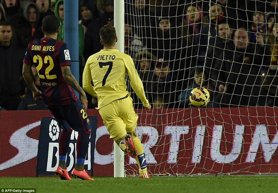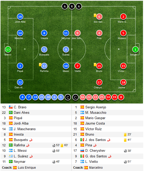 Đội hình thi đấu: Barcelona (4-3-3): Bravo; Pique, Mascherano, Alba, Alves; Busquets (Mathieu 72), Iniesta, Rafinha (Rakitic 88); Suarez (Pedro 79), Messi, Neymar. Villarreal: (4-4-2): Asenjo; Gaspar, Musacchio, Ruiz, Costa; Pina (Trigueros 77), J Dos Santos (Gomez 85), Cheryshev, Soriano, Vietto, G Dos Santos (Uche 89).
