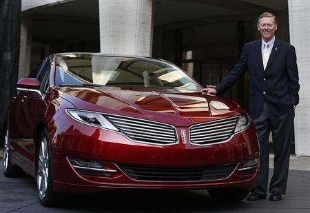 | Alan Mulally, Chủ tịch và Giám đốc điều hành của công ty Ford Motor, đứng bên cạnh chiếc Lincoln MKZ sedan cỡ trung trong một cuộc họp báo ở New York ngày 03 Tháng 12 năm 2012. |