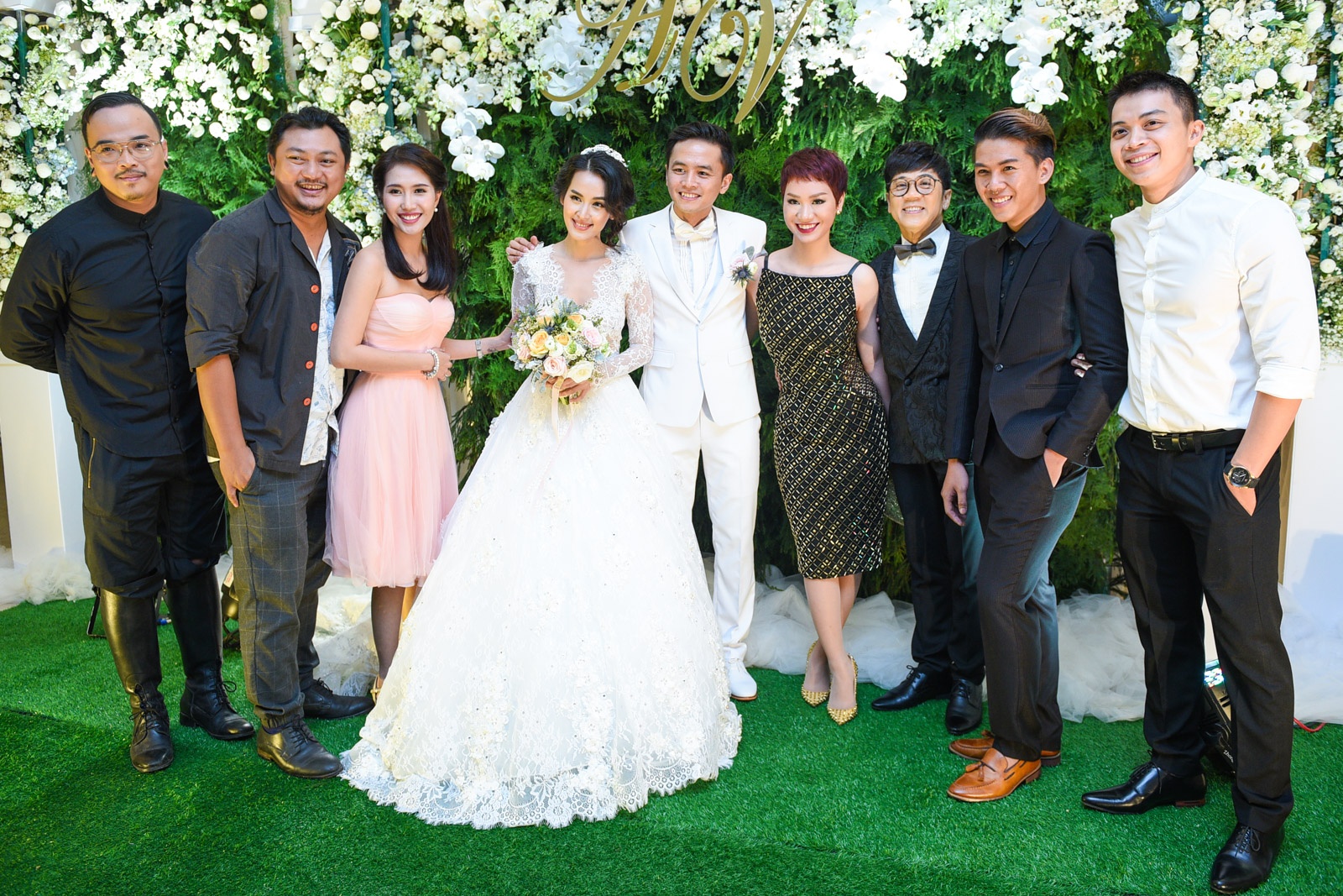 | Bạn thân của cô dâu - Sĩ Thanh - mặc đầm trắng tiệp màu cùng gam chủ đạo của hôn lễ đến chúc mừng đôi "tân lang, tân nương". |