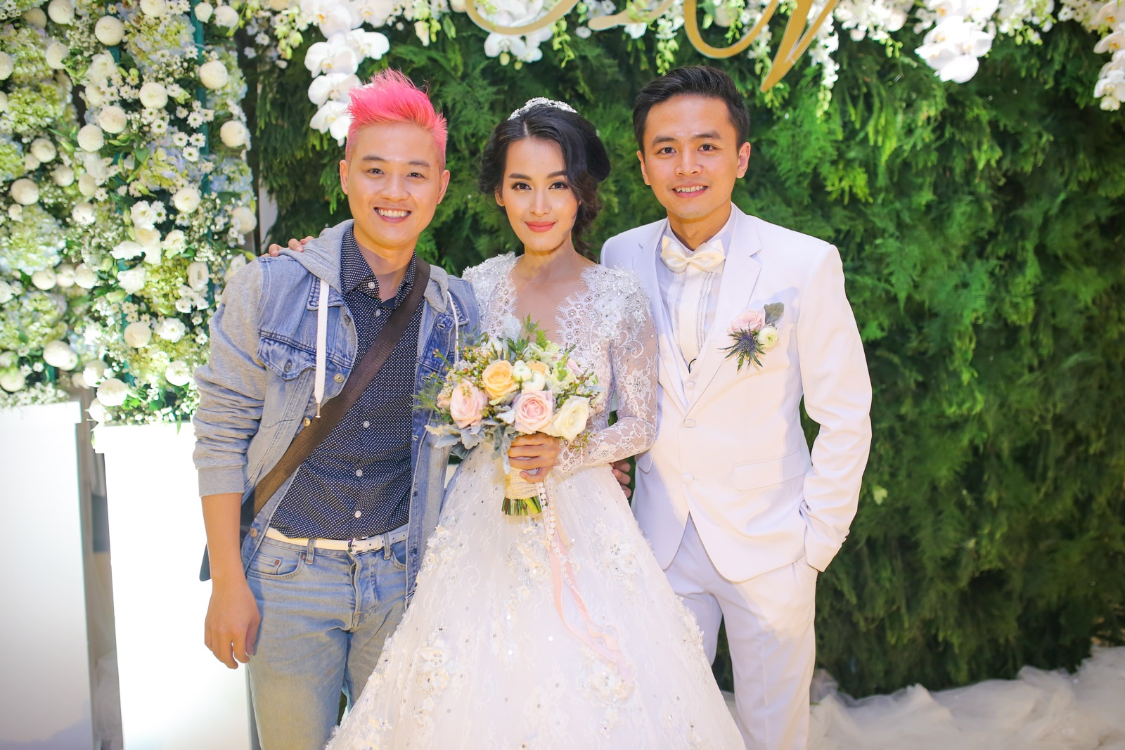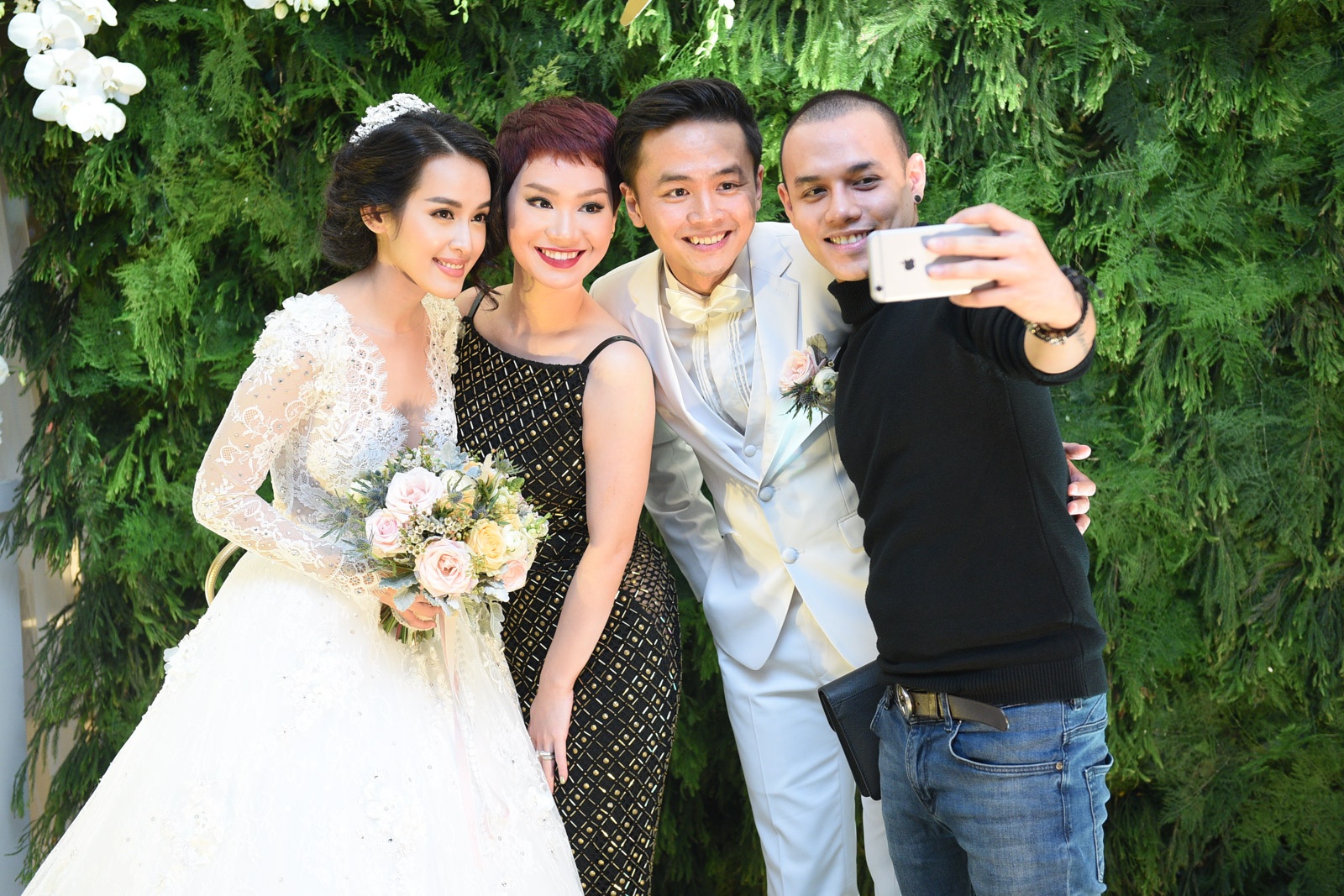| Diễn viên Mùa hè lạnh chụp ảnh cùng cô dâu chú rể. Người đẹp không quên dành những lời chúc ngọt ngào cho đàn chị thân thiết. Ảnh: Thành Trung |